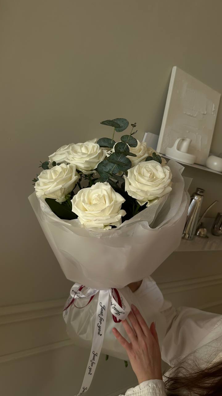 Белоснежные розы в окружении прохладной зелени эвкалипта — это манифест искренней и светлой любви. Лаконичное сочетание, которое выглядит дорого и благородно. Тонкий, свежий аромат эвкалипта подчеркивает безупречность каждого лепестка, создавая атмосферу спокойствия и нежности. Идеальный подарок для тех, кто ценит эстетику минимализма и вечную классику.