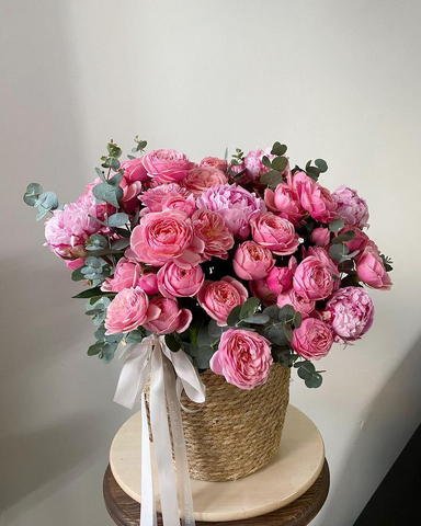 Каждая деталь — от бархатистых лепестков роз и нежных пионов до ароматного эвкалипта — добавляет особый шарм, а гармония цвета словно наполняет сердце теплом.