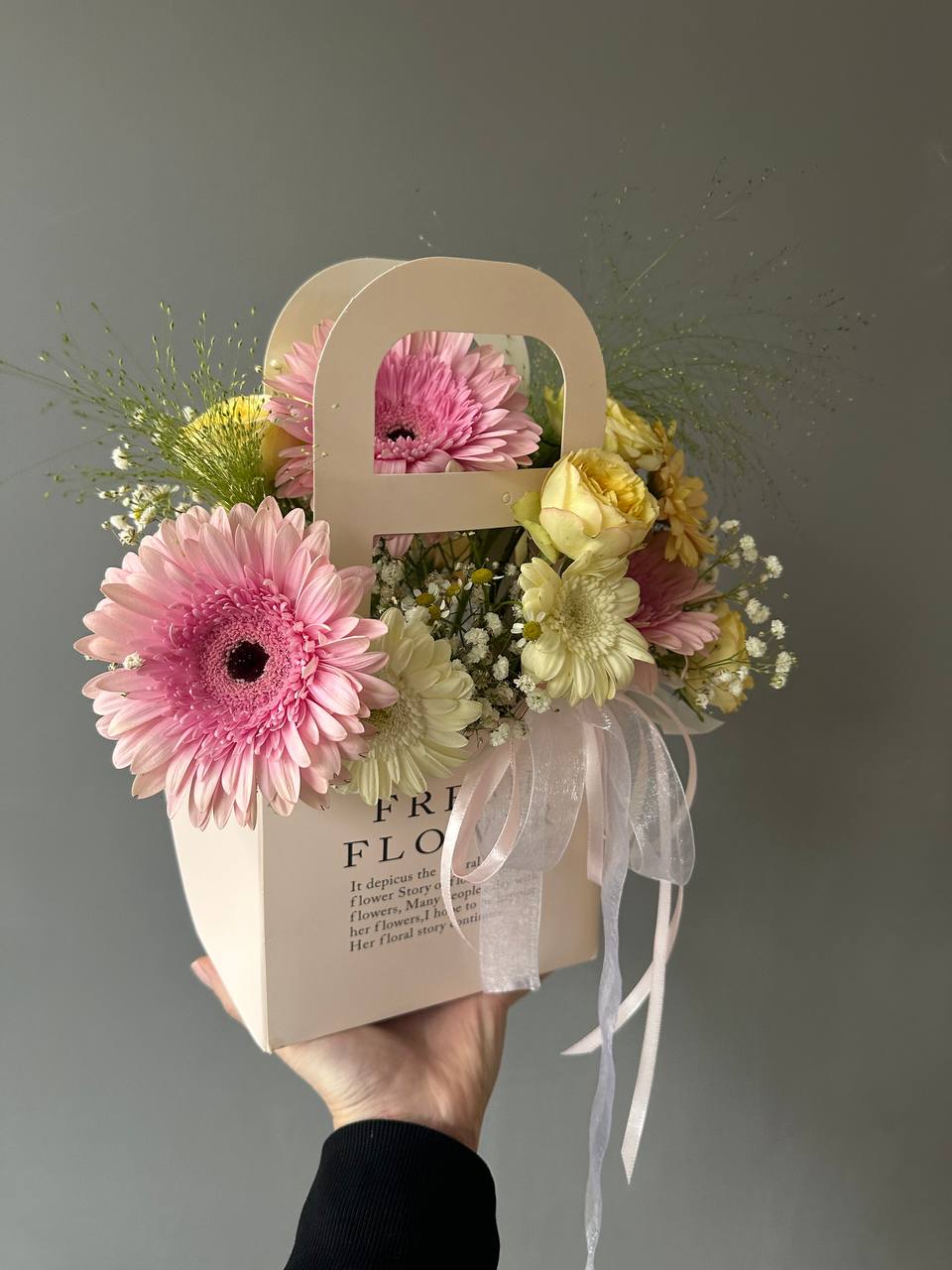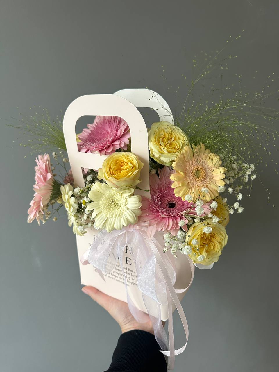 Состав: герберы, пионовидные кустовые розы, диантус, гипсофила, флористическая пена