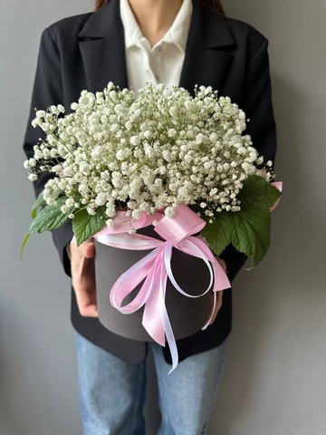 Состав: гипсофила, зелень, шляпная коробка, флористическая пена