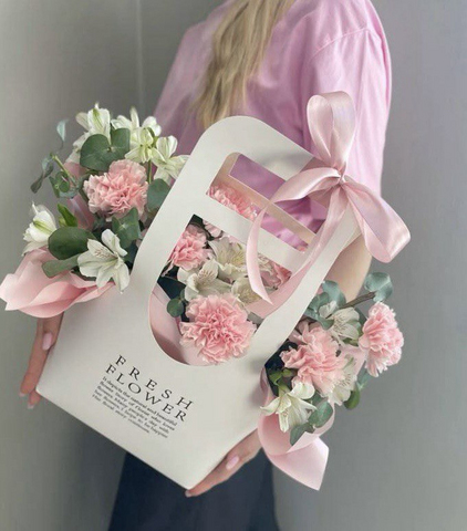 Состав: альстромерия, эвкалипт, диантусы, флористическая пена, сумочка