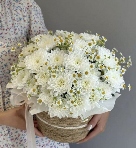 Эта композиция, наполненная эффектными оттенками и легкостью летнего настроения, станет идеальным украшением для любого праздника или уютного вечера. Танацетум с его зелеными и желтыми акцентами прекрасно дополняет элегантные хризантемы, создавая гармонию и свежесть. !