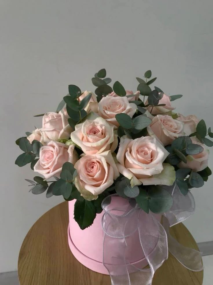 Состав: розы, эвкалипт, флористическая пена, шляпная коробка