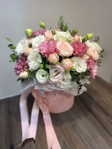 Состав: эустомы, кустовые пионовидные розы, флористическая пена, шляпная коробка