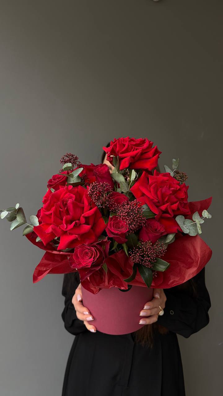 Состав: французские розы, эвкалипт, скиммия, красные розы, флористическая пена, шляпная коробка