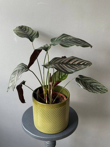 Калатея Сандериана - полосатая калатея с большими овальными листьями темного цвета. Именно темно-фиолетовый цвет на нижней стороне листа придает этому растению шикарный вид. Узор на ее листьях напоминает рыбьи кости. Вся эта фантастическая окраска способствует тому, что у растения всегда праздничная внешность. Калатея дает много листьев и имеет полноценный рост. Она также хорошо очищает воздух и способствует лучшему и более здоровому микроклимату в помещении. Листья улавливают загрязненные частицы и превращают их в кислород.
